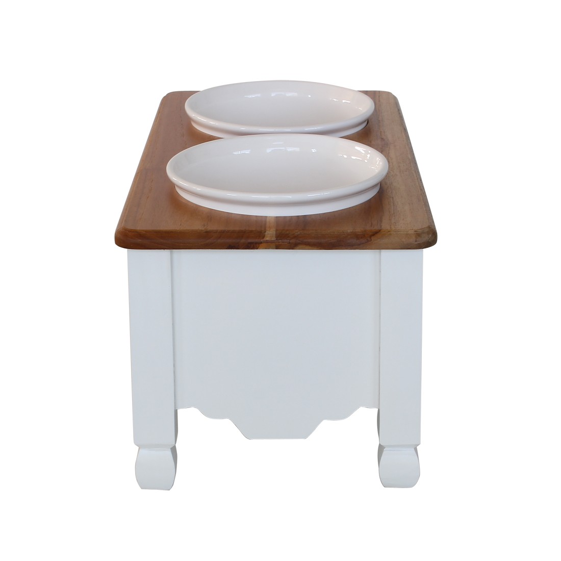 Dieser weiße Holzfutternapf hat holzfarbene Oberflächen und wird mit 2 Edelstahl- Futternäpfen geliefert. Ein luxuriöser Futternapf mit Wasser- und Futternapf für Ihren Vierbeiner!