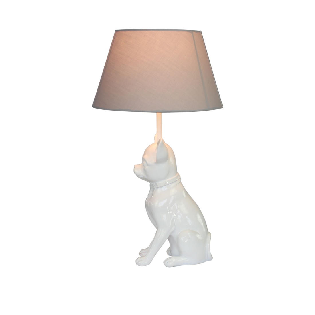 A chihuahua-shaped lamp in a high-gloss white finish. Looks great in any interior due to the use of natural light colors, beautiful on your side table, sideboard or dresser. The lamp is made of polyresin and comes with a white lampshade.