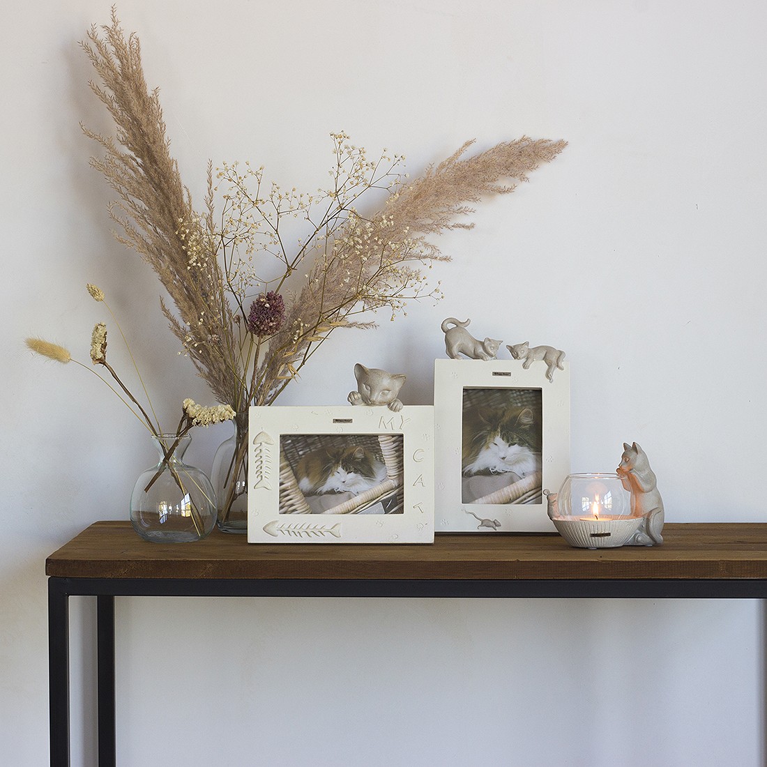 Your best memories of your four-legged friend deserve a nice place on your dresser, side table or wall. Nice are the details such as the head that protrudes above the edge and the fish bones on the edge of the photo frame. The text 'MY CAT' makes this a popular picture frame. Great to combine with the photo frame in standing model. Also available in dog version.