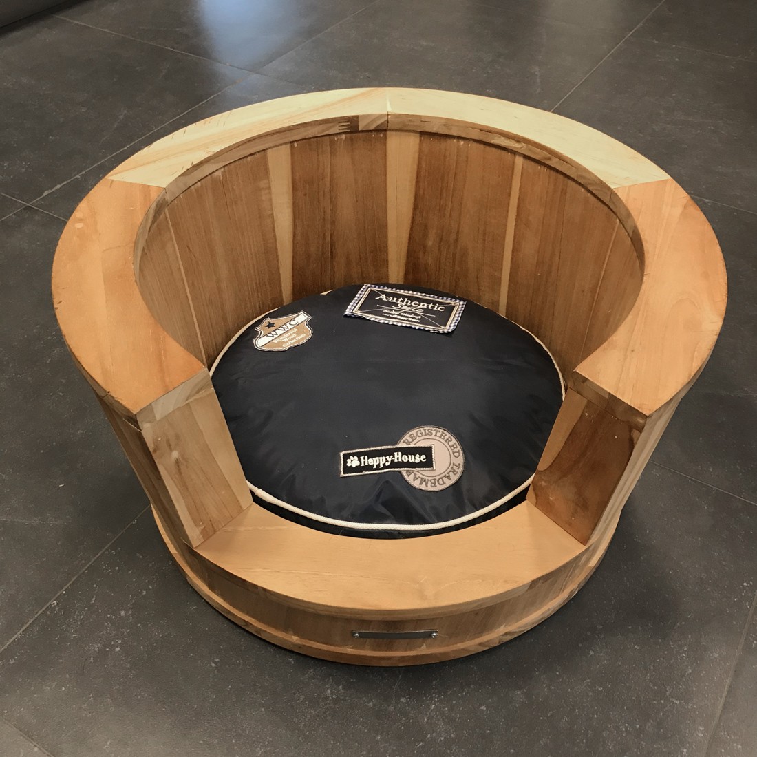 Happy-House round teak wooden dog or cat basket. Delivered with a dark blue pillow with beautiful embroidery, applications and luxurious border.