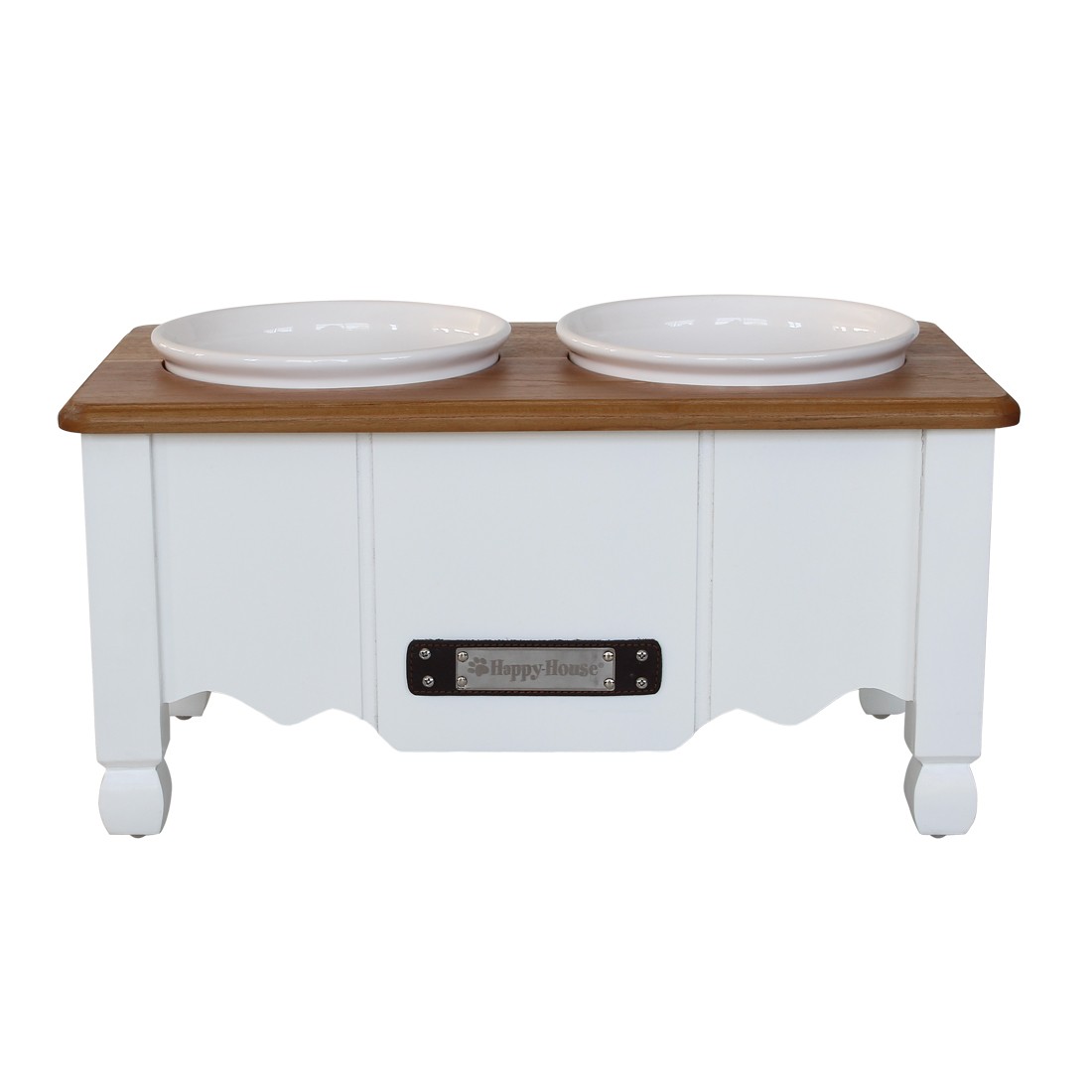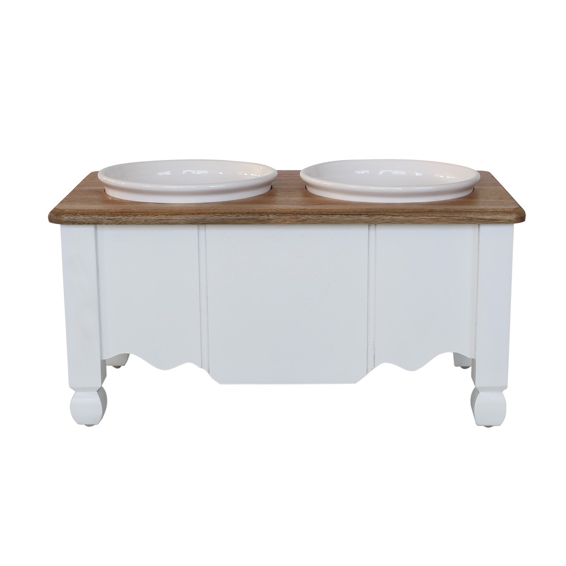 Deze wit houten voerbak heeft houtkleurige bovenkanten wordt geleverd met 2 RVS voerbakken. Een luxe voerbak met water en voerbak voor uw viervoeter!